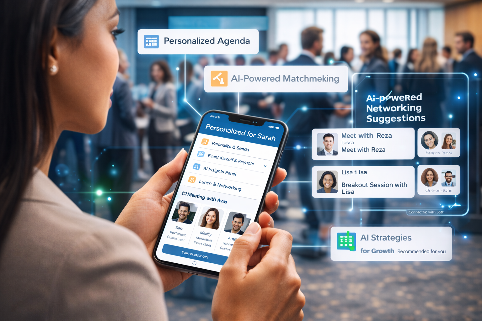 AI analyzes attendee profiles, interests, and goals to recommend meaningful connections. Whether someone is looking for collaborators, mentors, or potential clients, AI helps guide them to the right conversations.